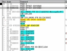 이런 화면을 볼수 있는데 여기가 바로 main()함수입니다. 일단 Comments를 보면 UNICODE 해서 문자열 입력이 있고 밑에 CALL DWORD PTR DS:[<&USER32.MessageBoxW>] 나오는 부분을 보면 Main()함수라는 것을 알 수 있습니다.